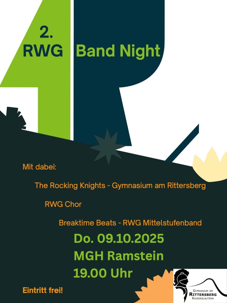 Die Fachschaft Musik des Reichswald-Gymnasiums lädt herzlich zur diesjährigen RWG-Bandnight ein. Das Konzert findet am 9.10.2025 um 19.00 Uhr im Mehrgenerationenhaus (MGH) Ramstein in lockerer Runde statt. Neben dem RWG Projekt-Chor und unserer Mittelstufenband "Breaktime Beats" werden die "Rocking Knights", die Mittelstufenband des Gymnasium am Rittersberg, zu hören sein. Unterstützt wird die Veranstaltung von der Technik AG.